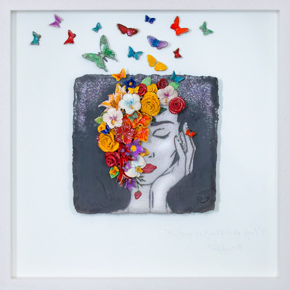 NEW! For a beautiful, strong woman! (or man!)....who may not realise that she is!...but deserves to know. An eye-catching, multicoloured piece which very three dimensional with an array of beautiful mixed flowers framing her face....