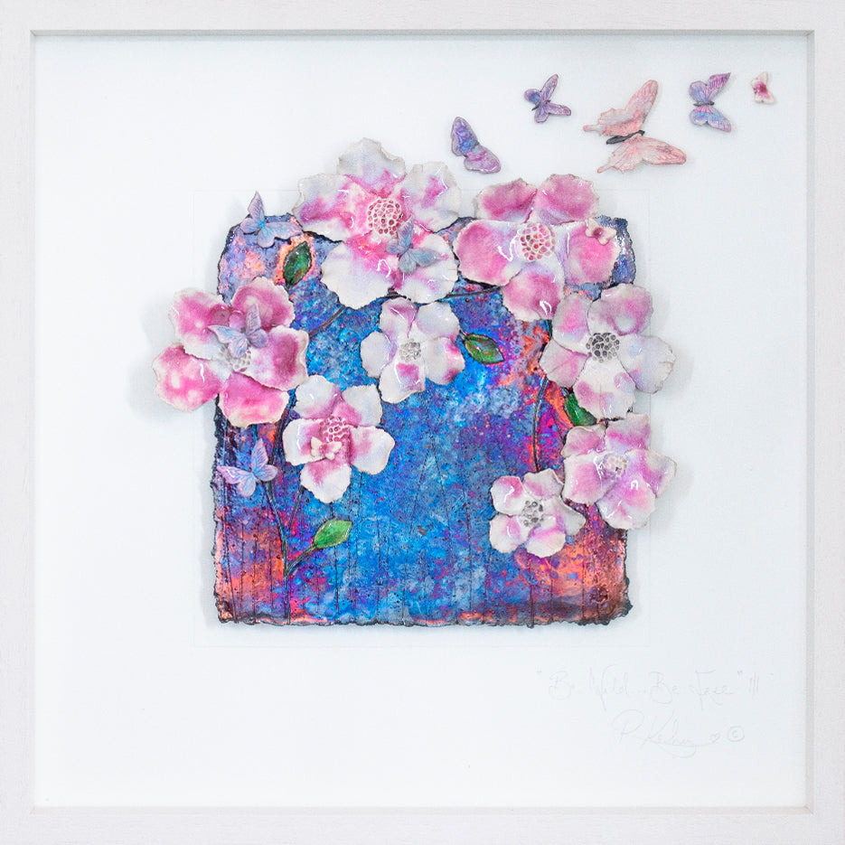 A spray of wild roses or 'Rosa Canina' (as my Mum tells me is the correct name for these!) blushed with deep pinks and lilacs/purples and delicately fringed with fluttering butterflies, on a stunning oil slick backdrop that will change colours and reflect as the lighting changes throughout the day.
