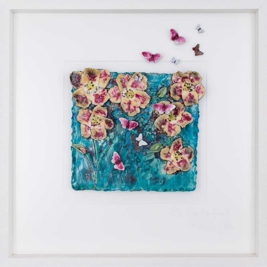 A spray of wild roses or 'Rosa Canina' (as my Mum tells me is the correct name for these!) on a metallic backdrop with roses blushed with deep pinks and delicately fringed with fluttering butterflies.