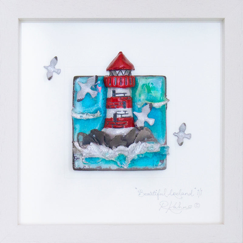 This piece depicts our stunning rugged Irish coastline with its crashing seas and one of its many quaint lighthouses that trim the fringes of our beautiful isle! The perfect interpretation of your favourite spot along the wild Atlantic way, the north, east or south coast....wherever your fond memories may be. Raku fired ceramic and glass framed wall art piece.