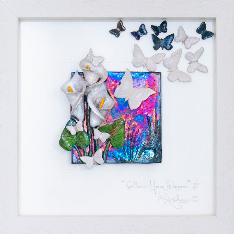 Serene butterflies adorning this triple, pure, crisp, antique white, lily piece on a stunning oil slick coloured, midnight backdrop...