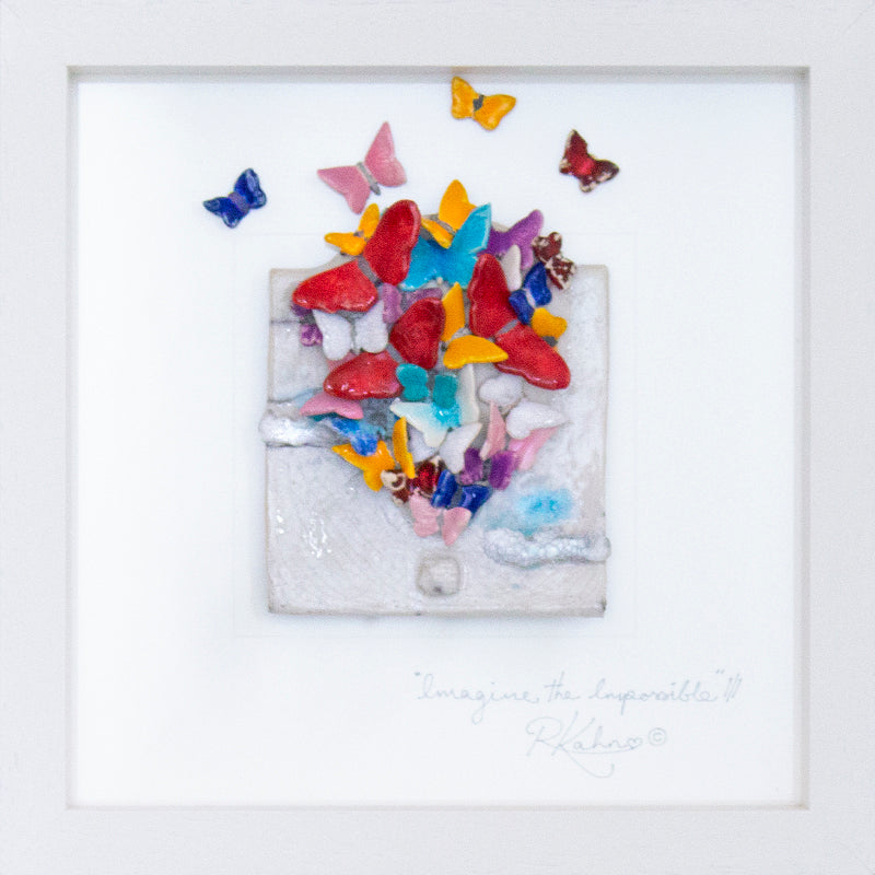I combined my whimsical hot air balloons with my butterflies! This piece is thought provoking with a sense of freedom, dreams, success, love and adventure! "Imagine the Impossible"....because that's where the magic begins...and anything is possible! Raku fired ceramic and glass framed wall art piece.
