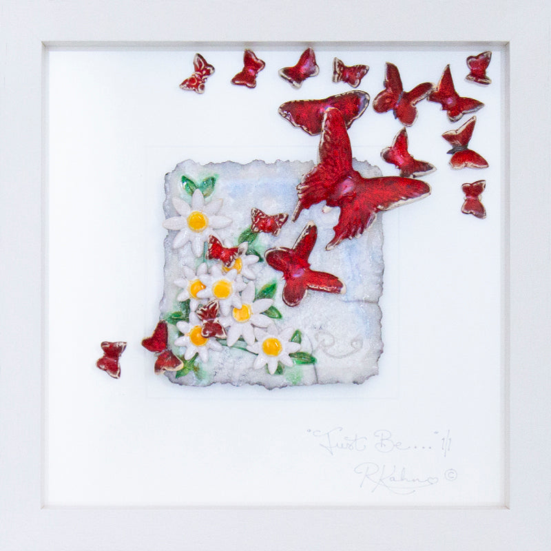 This piece is bursting with passion and fire with it's rich fiery red butterflies and delicate, pretty, wild daisies. Carrying the very important message to "Just Be..." because we don't always have to be 'doing something'...sometimes it's okay, to "Just Be..."