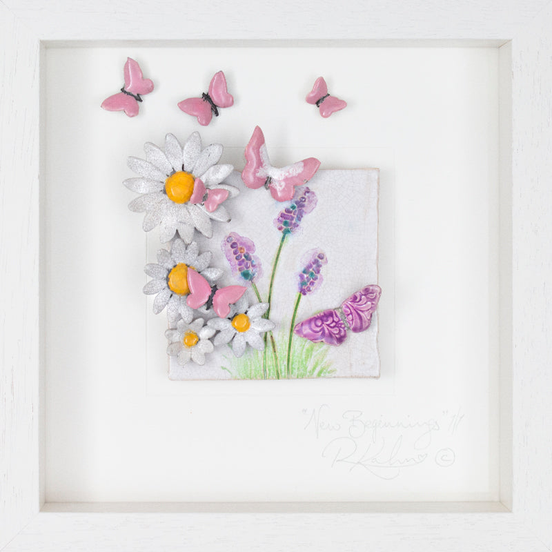 Feminine, lavender, purples and pink, with delicate wild daisies in a wild flower meadow, in this piece portraying a wonderful message, 'New Beginnings'...
