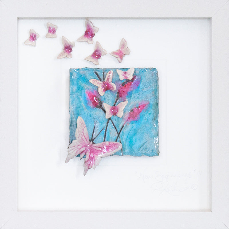 A stunning, vibrant, refreshing, turquoise backdrop with hints of pink lavender and metallics and delicate butterflies in shades of pink....