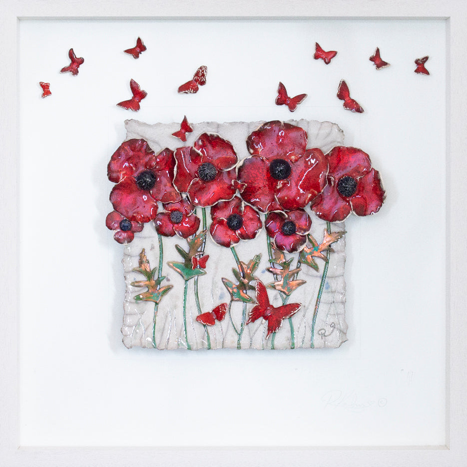 Vibrant deep red poppies! in a meadow of delicate, dreamy, wild flowers and butterflies, a striking and mesmerising, eye-catching piece for any room.