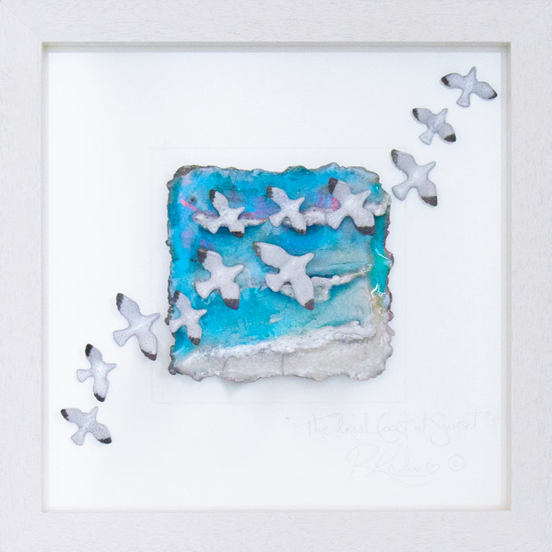 This piece portrays the stunning, rugged coastline of our beautiful Ireland! With calming turquoises and blues and little flecks of metallics where the sunset reflections kiss the waves.... May remind you of your favourite beach as a child...